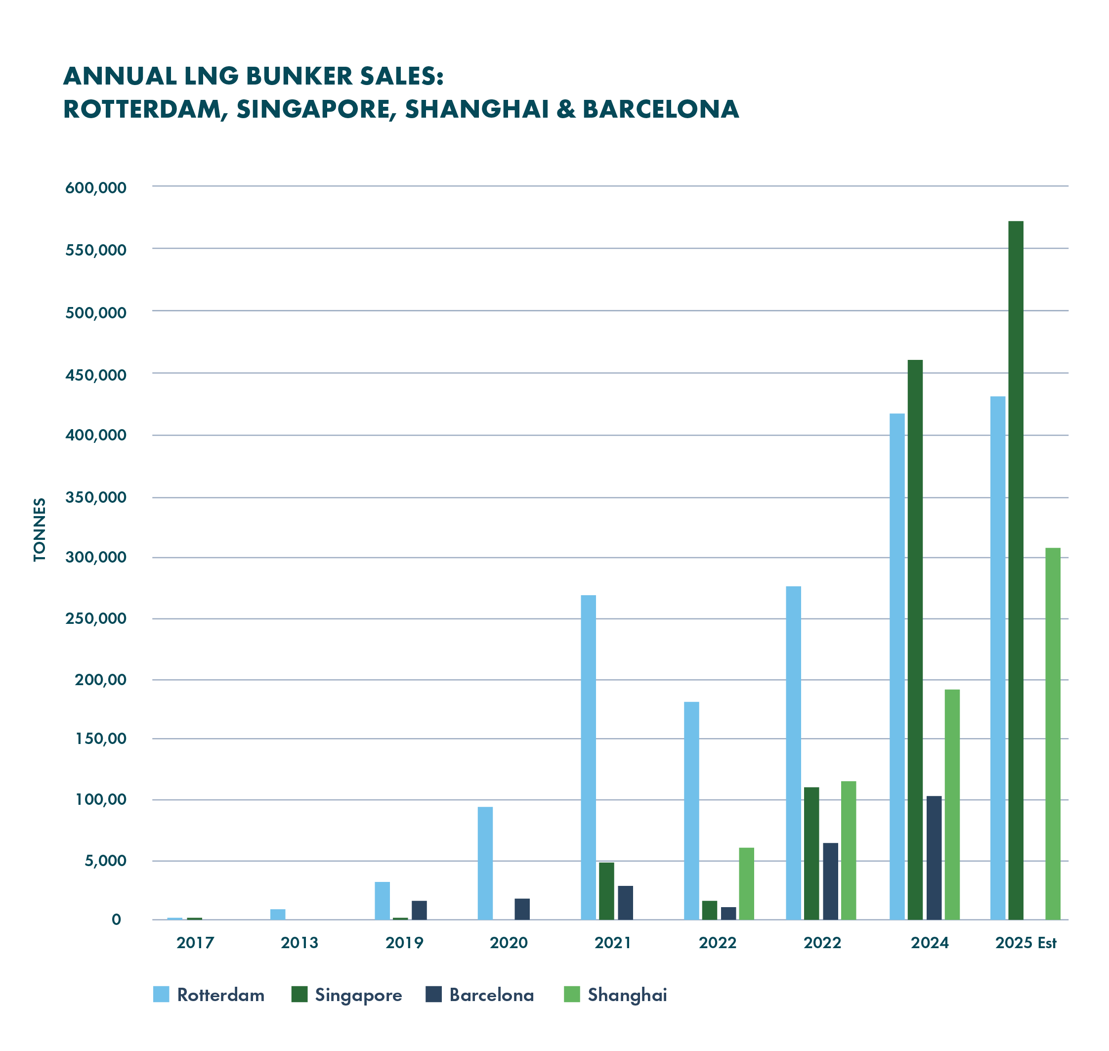 LNG bunkering is now offered in 222 ports globally. The number of bunkering vessels has increased from a single vessel in 2016 to over 62 in 2025 with a strong order book of 38. The report also highlights rapid developments in LBM, with new research mapping biomethane bunkering availability, as well as the nascent supply of e-methane.